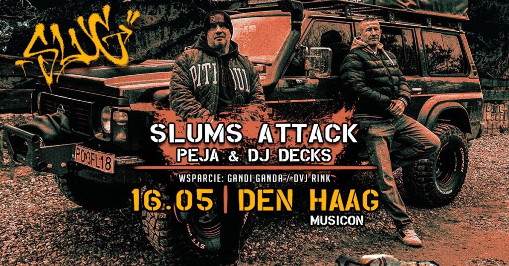 Peja i Dj Decks / SLUMS ATTACK komen naar Musicon Den Haag op 16 mei 2026 voor een concert dat in het teken staat van de promotie van hun nieuwste album SLUG. Verwacht een avond met de herkenbare energie van een legendarische rapformatie, met Peja en DJ Decks op het podium. Naast nieuw materiaal van SLUG hoor je tijdens deze show ook de grootste bangers van Ryśiek, zoals aangekondigd voor deze avond. De show vindt plaats in Den Haag bij Musicon, met aanvang om 20:00. Tickets zijn verkrijgbaar via de link in de eventinformatie. Een duidelijke afspraak voor rapliefhebbers die deze act live willen meemaken—met focus op nieuw werk én bekende tracks op één avond.